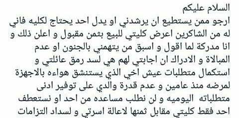 وبحسب الإعلان المنشور على 'فيس بوك'، طلبت الشابة المساعدة لإيجاد مريض بحاجة لكلية، مشيرة إلى أنها تعرض كليتها مقابل ثمن مقبول، حسب تعبيرها.