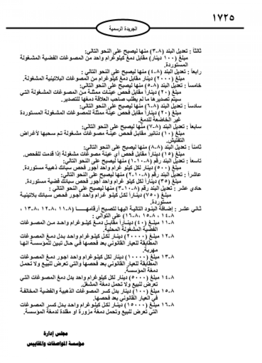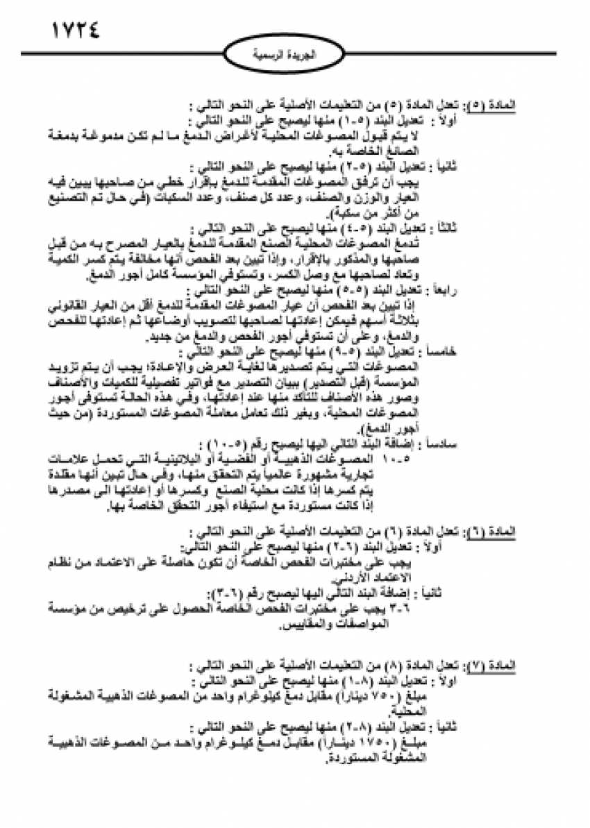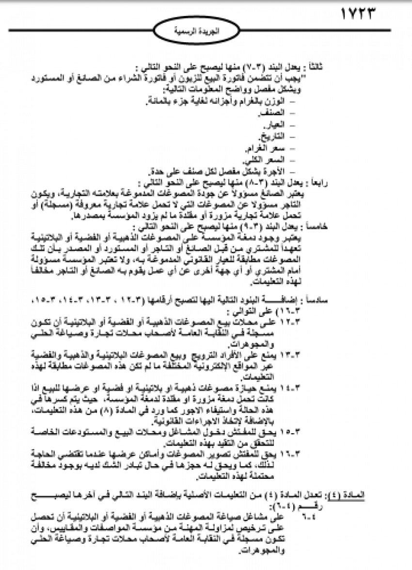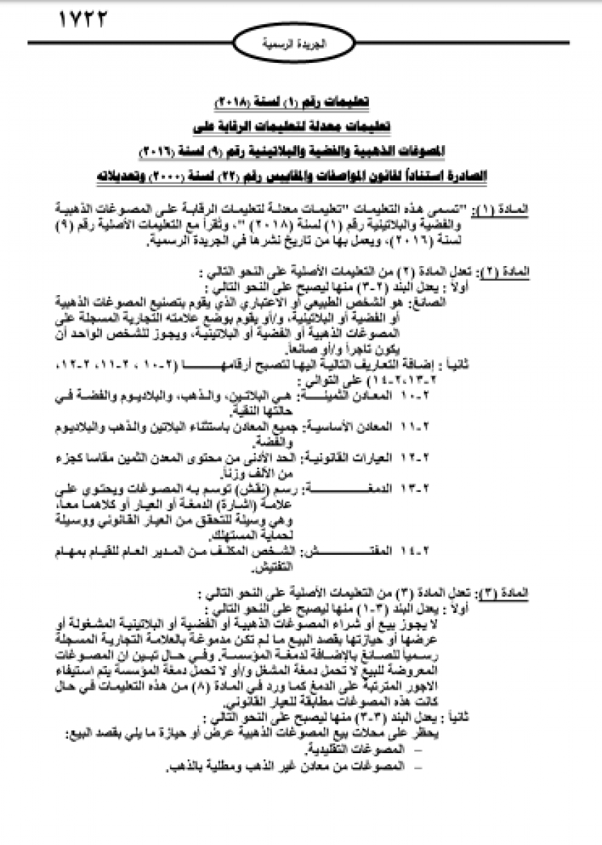 صدر في العدد الأخير للجريدة الرسمية تعليمات الرقابة على المصوغات الذهبية والفضية والبلاتينية.