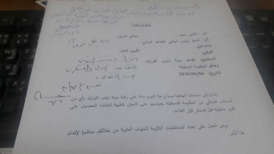 وجاء في الكتاب، 'بناء على رغبة رئيس الوزراء وأي من أعضاء حكومته المستقيلة، بعرضهم على اللجان الطبية لغايات الحصول على تقرير معلولية قبل إصدار قرار التقاعد'.