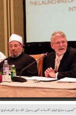 جراءة نيوز - عمان : انتشرت صورة للشيخ العلامة يوسف القرضاوي رئيس هيئة علماء المسلمين بجانب مخرج الفيلم القذر المسيء للرسول صلى الله عليه وسلم .