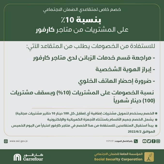 أعلنت المؤسسة العامة للضمان الاجتماعي، اليوم الخميس، عن خصم خاص لمتقاعدي الضمان الاجتماعي بنسبة 10٪ على المشتريات من متاجر كارفور، وفق الشروط المرفقة بالصورة التالية: