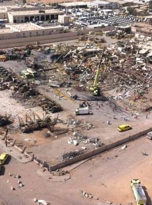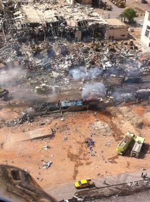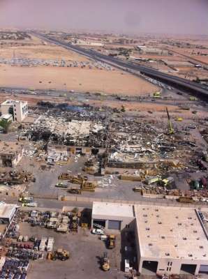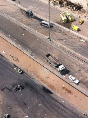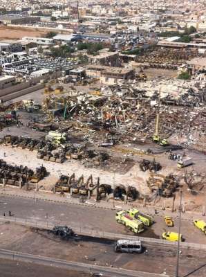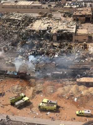 نشرت مصادر السعوديه صورا جوية لحادثة انفجار شاحنة الغاز التي تسببت في وفاة 14 وإصابة أكثر من 100, وتظهر الصور الجوية التي التقطت من طائرة الأمن، حجم الدمار الذي لحق بالمنطقة جراء الانفجار.