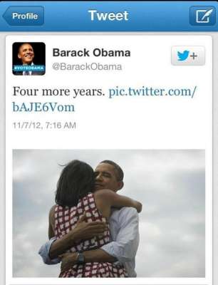 وفي سياق رصد المتابعة العربية للانتخابات الأمريكية على فيس بوك ، علقت فتاة وصفت نفسها بـ"عربية حرة" على صورة النصر لاوباما ،وقد أبدت اعجابها باختياره لهذه الصورة في حين ايدها عدد كبير من الفتيات ، وقالت:"أول مافاز أوباما في الأنتخابات الرئاسية للولايات المتحدة الأمريكية وضع في تويتر صورة له حاضناً زوجته أمام الملايين وكتب : ٤ سنوات أضافية.