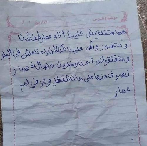 وكتب الطفل عبدالله، البالغ من العمر 11 عامًا في رسالة مؤثرة : "ماما متقلقيش علينا أنا وعمار طفشت من البيت، ومتدوريش علينا إحنا مش في البلد، ومتقلقوش إحنا واخدين حصالة عمار نصرف منها لحد ما نلاقي شغل، وعرفي أم عمار”.
