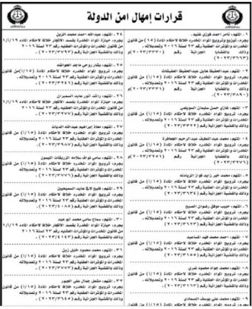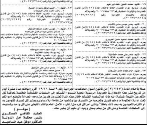 أمهلت محكمة أمن الدولة متهمين، 10 أيام، لتسليم أنفسهم للسلطات القضائية المختصة لمحاكمتهم على التهم المسندة إليهم، وإلا سيتم اعتبارهم فارين من وجه العدالة، وتوضع أموالهم تحت إدارة الحكومة ويحرمون من التصرف بها ويمنعون من إقامة أية دعاوى ويعتبر كل تصرف يقومون به أو التزام يتعهدون به بعد ذلك باطلا.