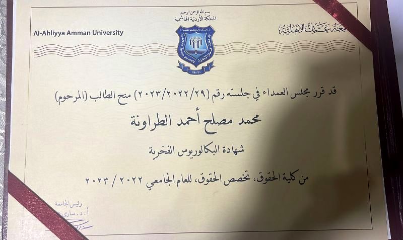 كان من المفترض أن يحضر محمد "نجل"الاستاذ الدكتور مصلح الطراونة نائب رئيس جامعة عمان الاهلية وعميد كلية الحقوق في الجامعة " حفل تخرجه يوم السبت 22-7-2023، ولكن مشيئة الله قضت أن يغادر محمد الى جوار ربه اثر حادث سير مؤخرا ... حيث منحه مجلس عمداء جامعة عمان الاهلية شهادة البكالوريوس الفخرية بتخصص الحقوق ...واستلمت الشهادة نيابة عنه شقيقته ناتالي ......... وقد كتب أ.د .مصلح الطراونة كلمة رثاء تدمي القلوب لنجله المرحوم محمد في يوم تخرّجه لكنه رفض نشرها لئلا يؤذي مشاعر رفاقه الخريجين ،هذا نصها: