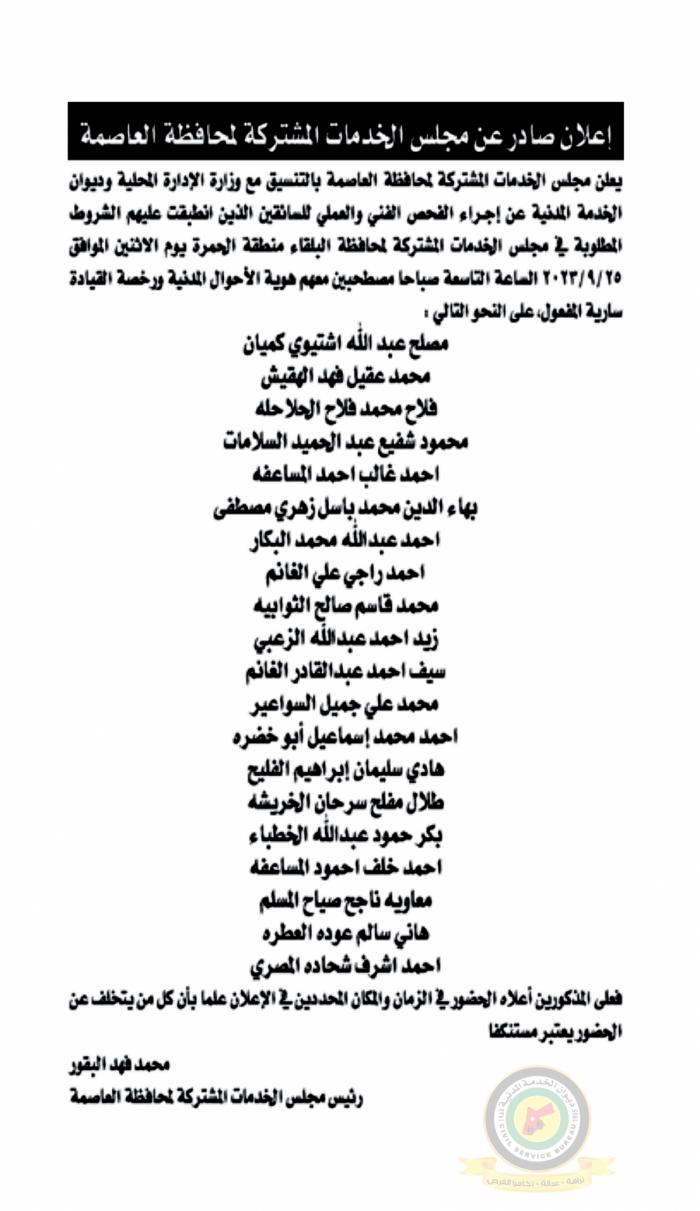 أعلن ديوان الخدمة المدنية عن دعوة متنافسين للمشاركة في الفحص الفني والعملي المقرر عقده يوم الاثنين الموافق 25 سبتمبر/أيلول 2023 .