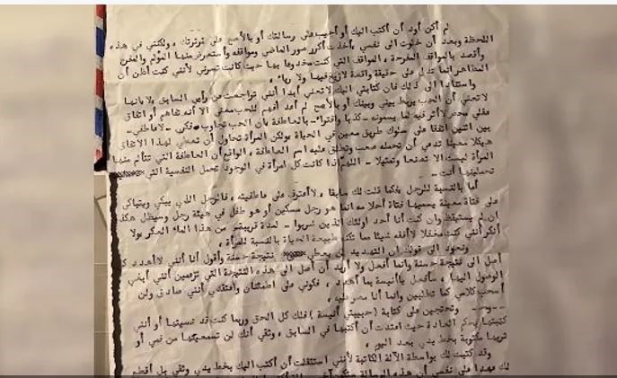 وجاء في الرسالة التي يقرأ جزءا منها من قام بتصوير الفيديو: "أنيسة لم أكن أود أن أكتب إليك أو أجيب على رسالتك أو بالأصح على ثرثرتك، واستنادا إلى ذلك لا تعني أبدا أنني تراجعت عن رأيي السابق. إنها لا تعني أن الحب يربط بيني وبينك. أو بالأصح لم أعد أفهم للحب معنى إلا أنه تفاهم أو اتفاق عقلي محض لا أثر لما يسمونه كذبا وافتراء بالعاطفة".