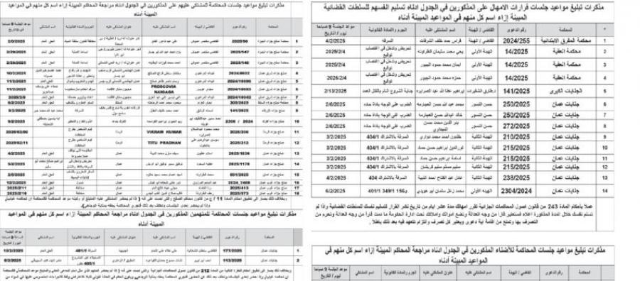 صدرت اليوم الاثنين، مذكرات تبليغ مواعيد جلسات المحاكمة لمشتكى عليهم ولمتهمين وقرارات امهال لحضور جلسات محاكمة.