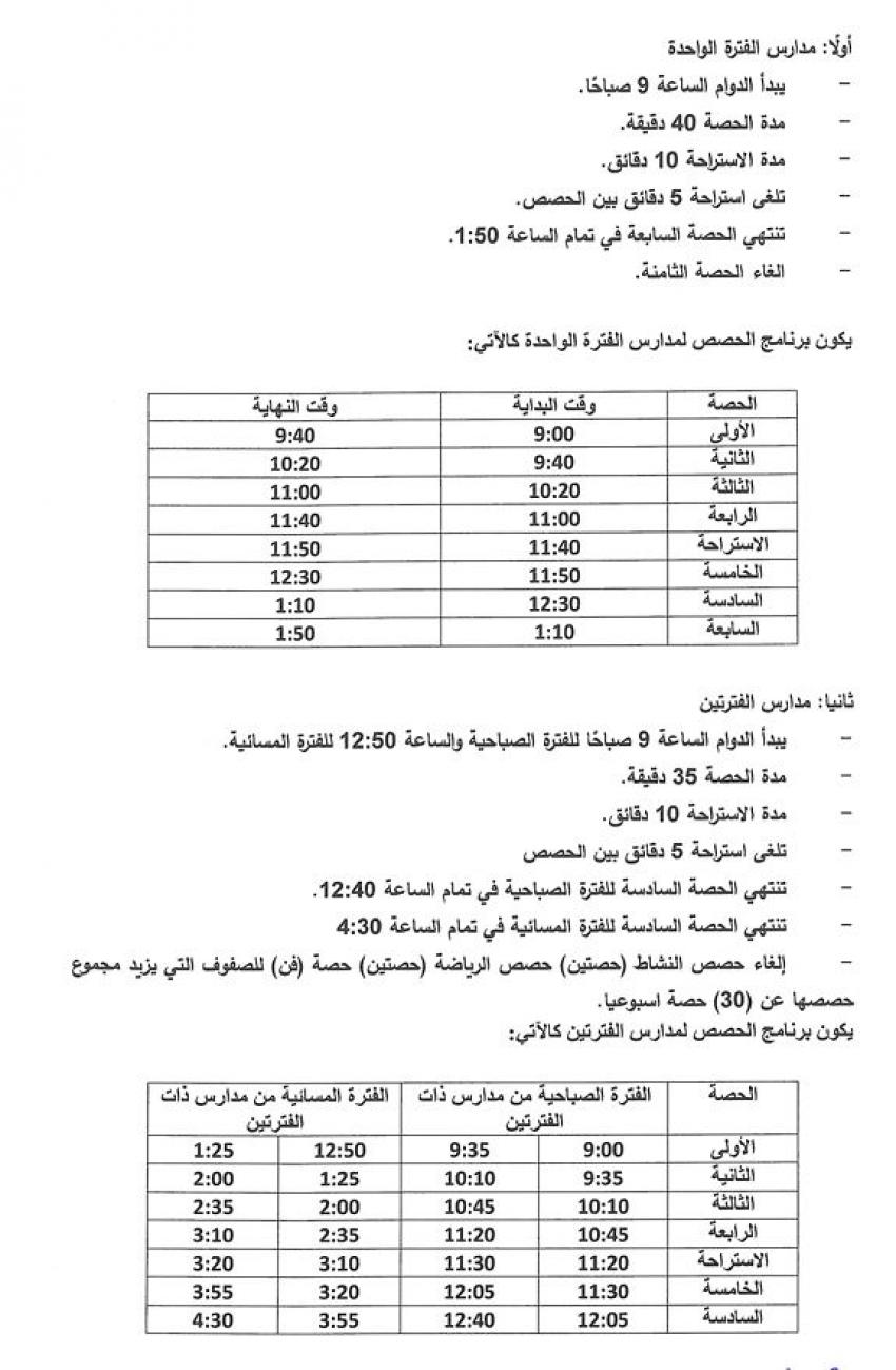 وتبدأ الحصة الأولى في المدارس عند تمام الساعة التاسعة صباحًا، وتكون مدة الحصة الصفية في مدارس الفترة الواحدة (40) دقيقة، ومدة الحصة الصفية في مدارس الفترتين (35) دقيقة على أن تبدأ الحصة الأولى في الفترة المسائية 12:50.