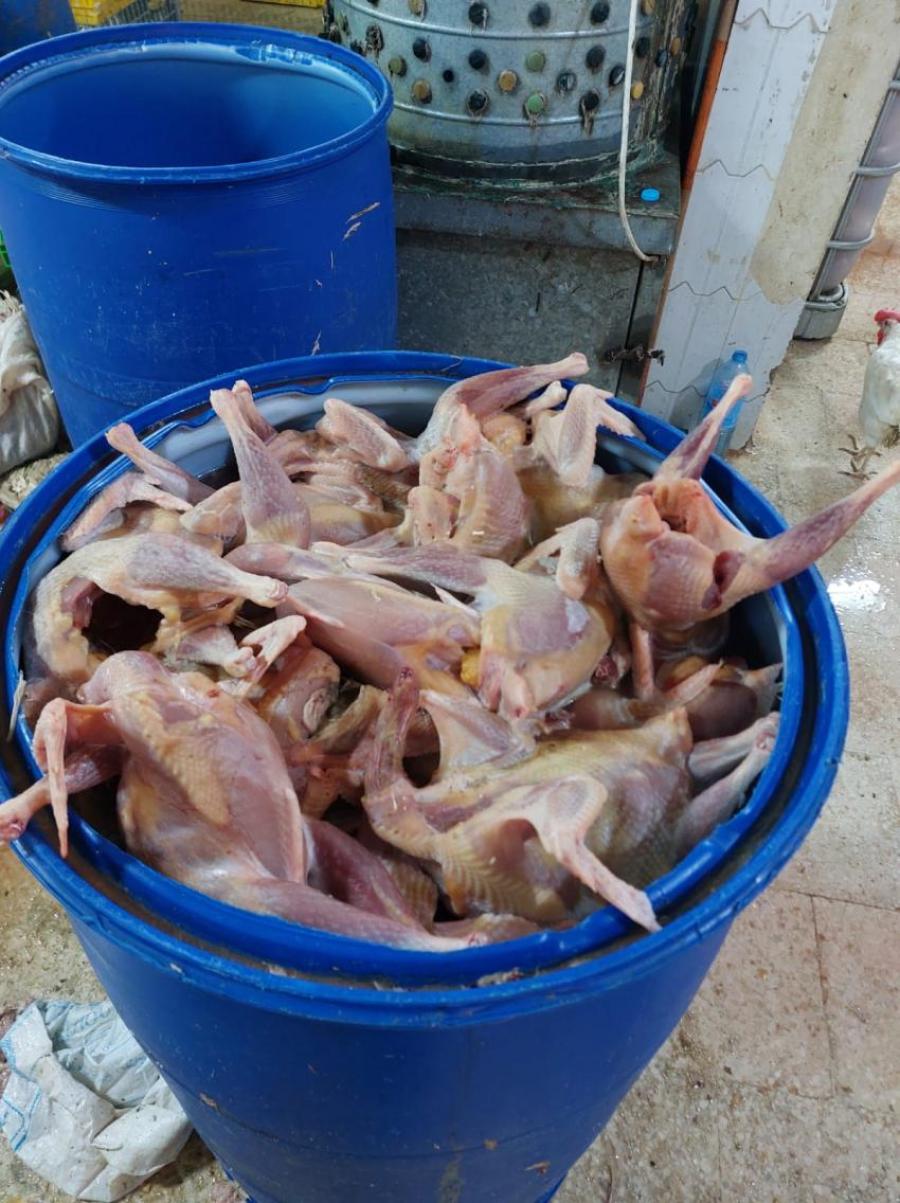 أتلفت كوادر بلدية الرصيفة في منطقة جبل الامير فيصل أطنانًا من الدجاج المذبوح غير الصالح للاستهلاك البشري وتم إغلاق الموقع "شقة سكنية" الذي يتم العمل به بالشمع الأحمر واتخاذ كافة الإجراءات القانونية اللازمة.