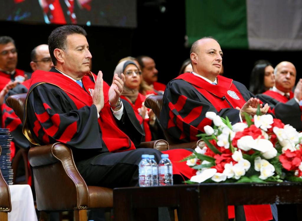 • وقبل بدء كلمات وفقرات الحفل ، قام الدكتور ماهر الحوراني رئيس هيئة المديرين للجامعة والاستاذ الدكتور ساري حمدان رئيس الجامعة بتقديم درع الجامعة التذكاري تكريماً لراعي الحفل.