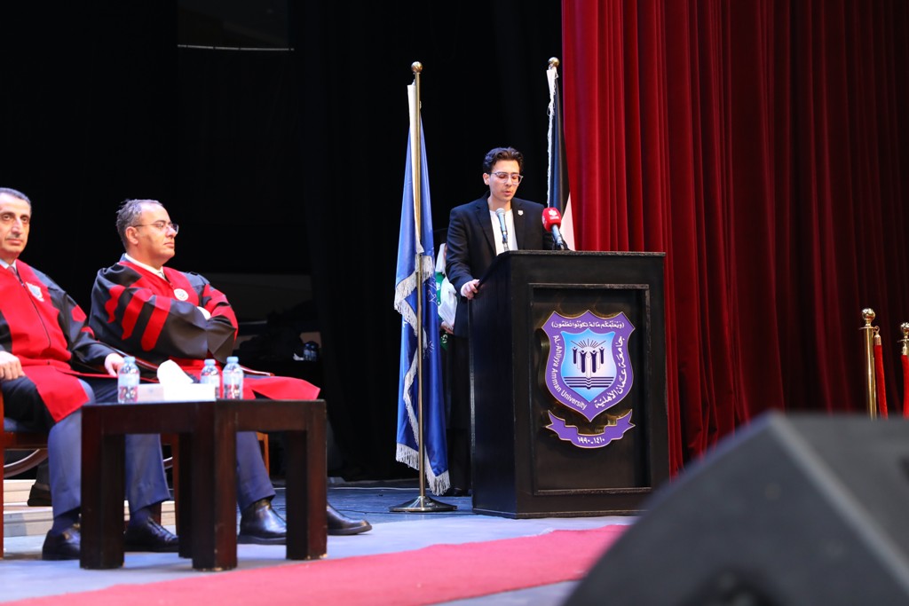 ** واختتم كلمته بالقول : وفقنا الله جميعاً لخدمةِ جامعتِنا وخدمةِ أردننا الغالي في ظل حضرة صاحب الجلالة الهاشمية الملك عبد الله الثاني ابن الحسين وولي عهده الأمين.