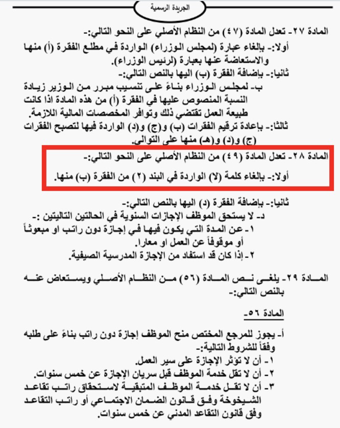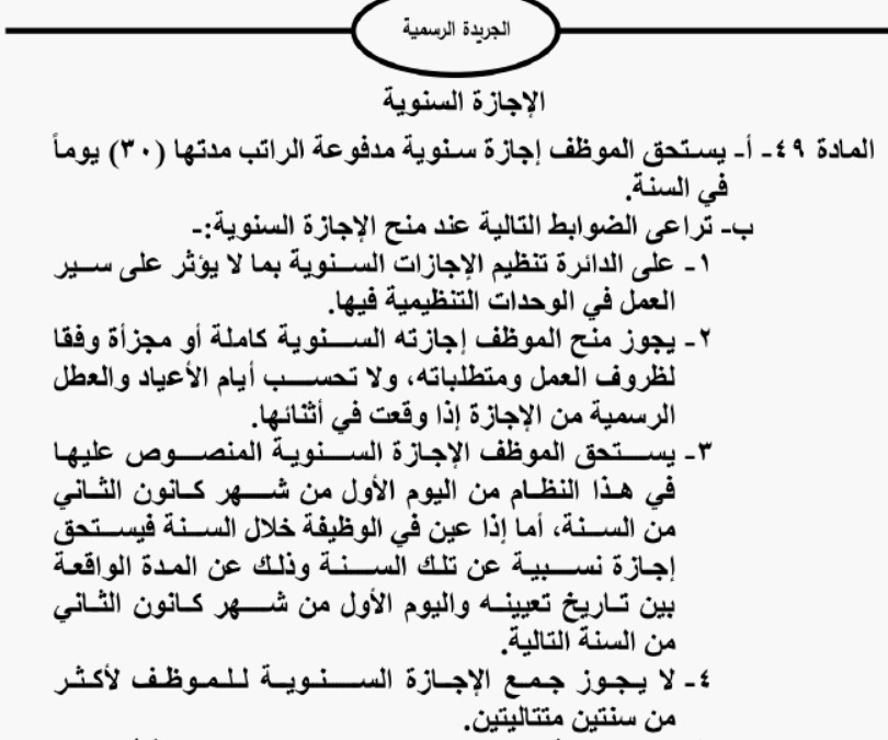 وكان النص الأصلي للمادة (49) قبل التعديل ينص على: "يجوز منح الموظف إجازته السنوية كاملة أو مجزأة وفقاً لظروف العمل ومتطلباته، ولا تحتسب أيام الأعياد والعطل الرسمية من الإجازة إذا وقعت خلالها." إلا أن التعديل الأخير ألغى الاستثناء المتعلق بعدم احتساب العطل الرسمية ضمن الإجازة.