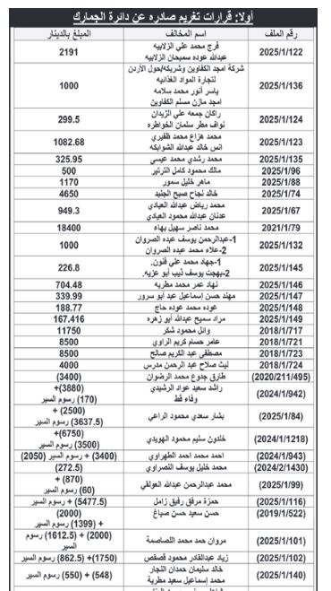 أعلنت دائرة الجمارك الأردنية، اليوم الأحد، قرارات تغريم ومطالبة وتحصيل صادرة بحق عدة أشخاص وشركات.