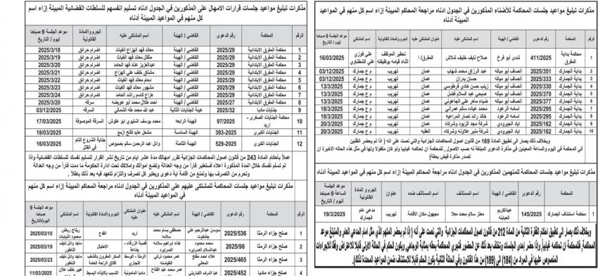 صدرت اليوم الاثنين، مذكرات تبليغ مواعيد جلسات المحاكمة لمشتكى عليهم ولمتهمين وقرارات امهال لحضور جلسات محاكمة.