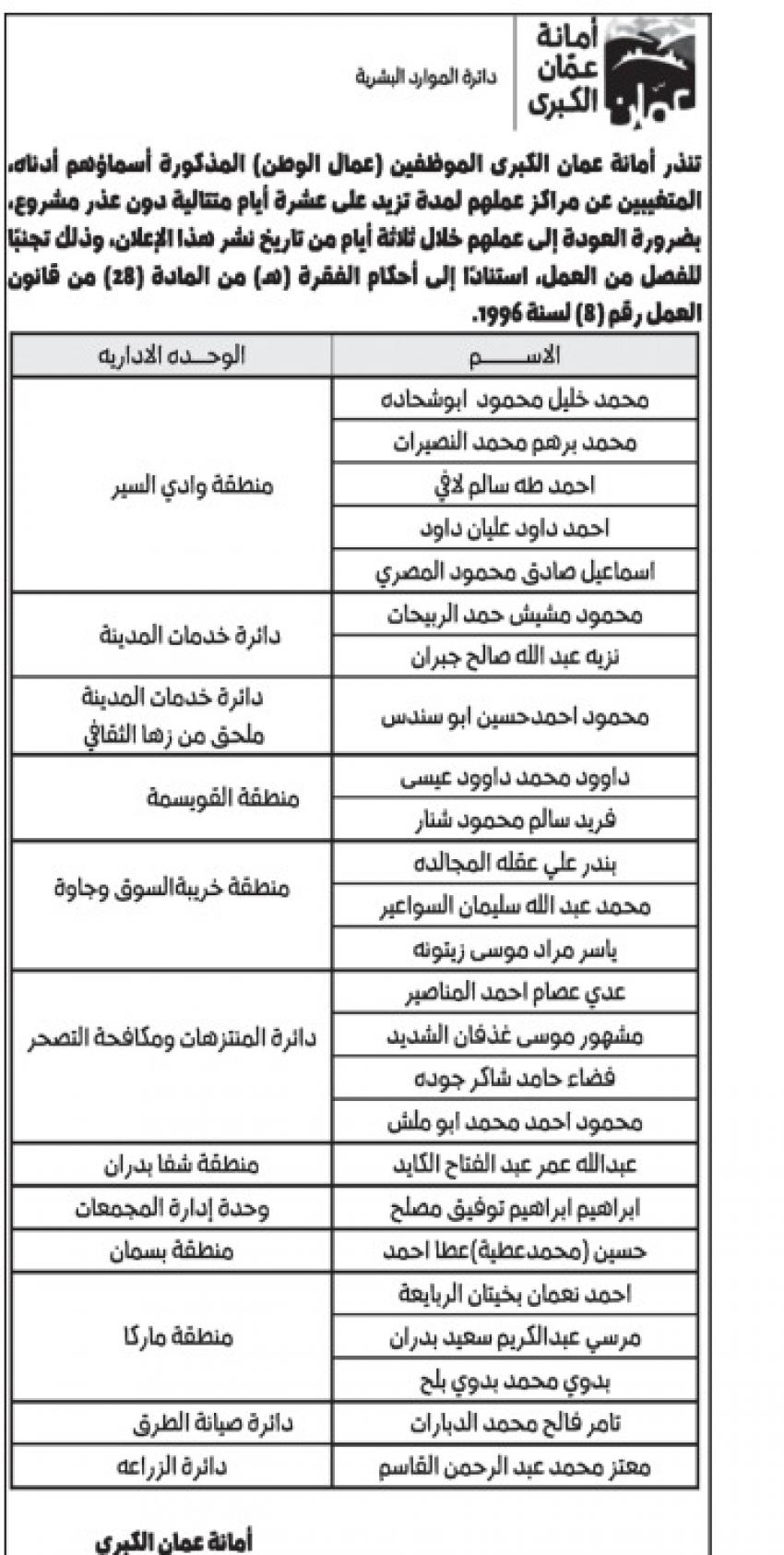 أنذرت أمانة عمان الكبرى، اليوم الخميس، 25 عامل وطن، بالعودة الى عملهم خلال 3 أيام ، والا سيتم فصلهم بسبب تغيبهم عن العمل لمدة تزيد عن 10 أيام.