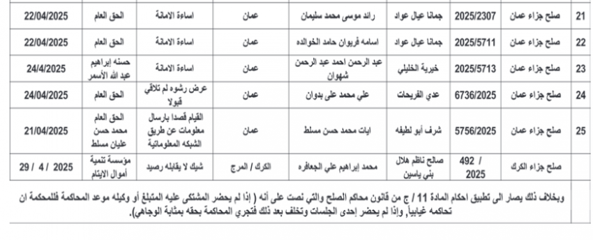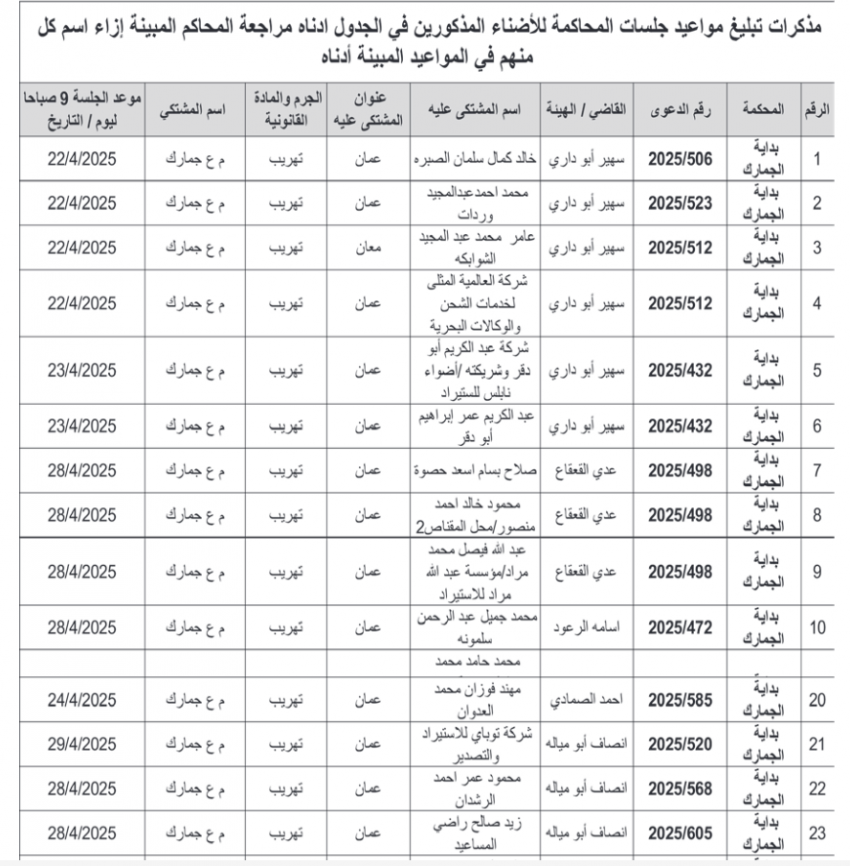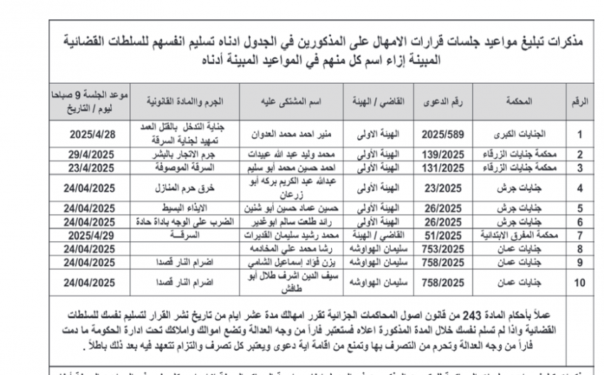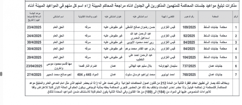 مذكرات تبليغ ومواعيد جلسات محاكمات لأردنيين (أسماء)