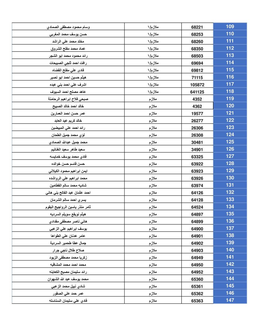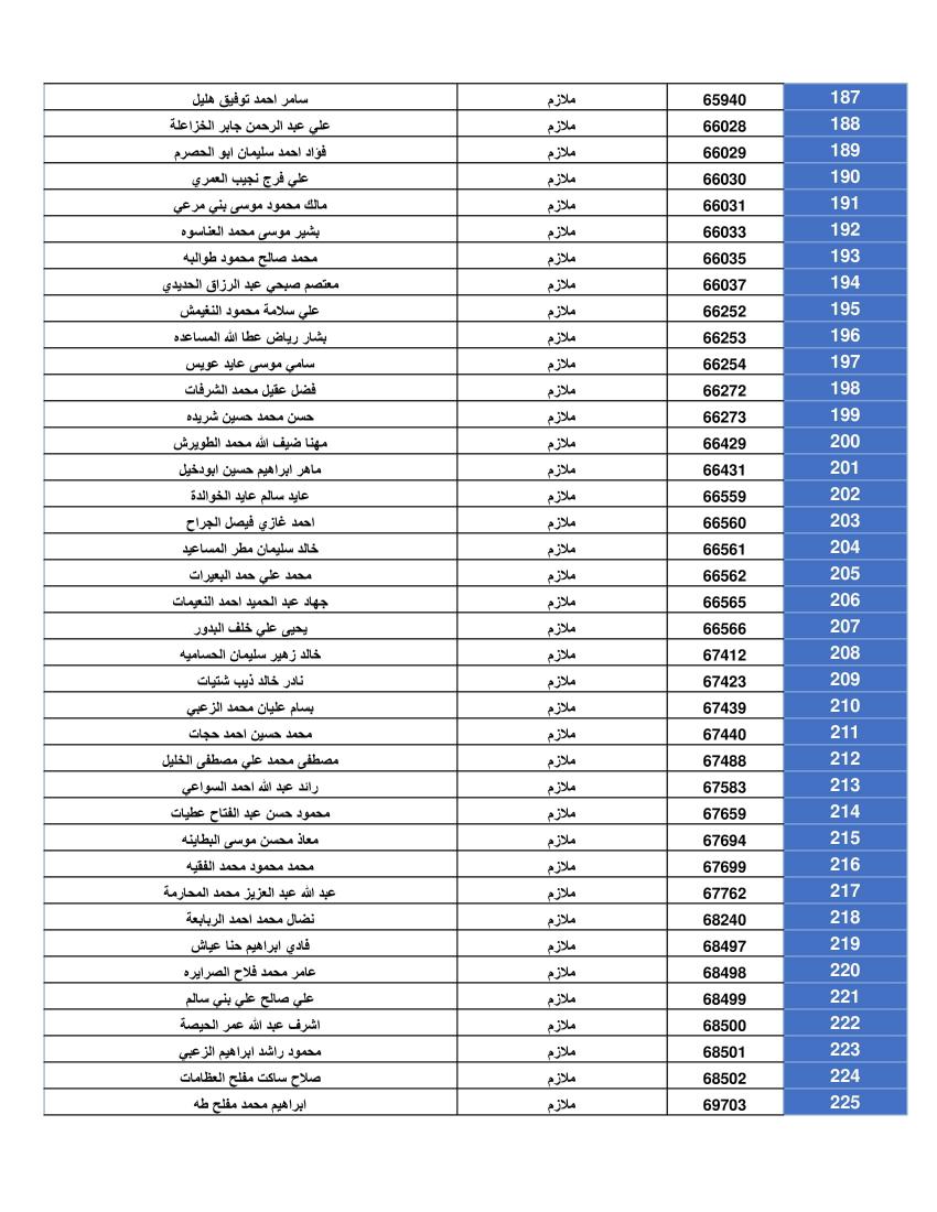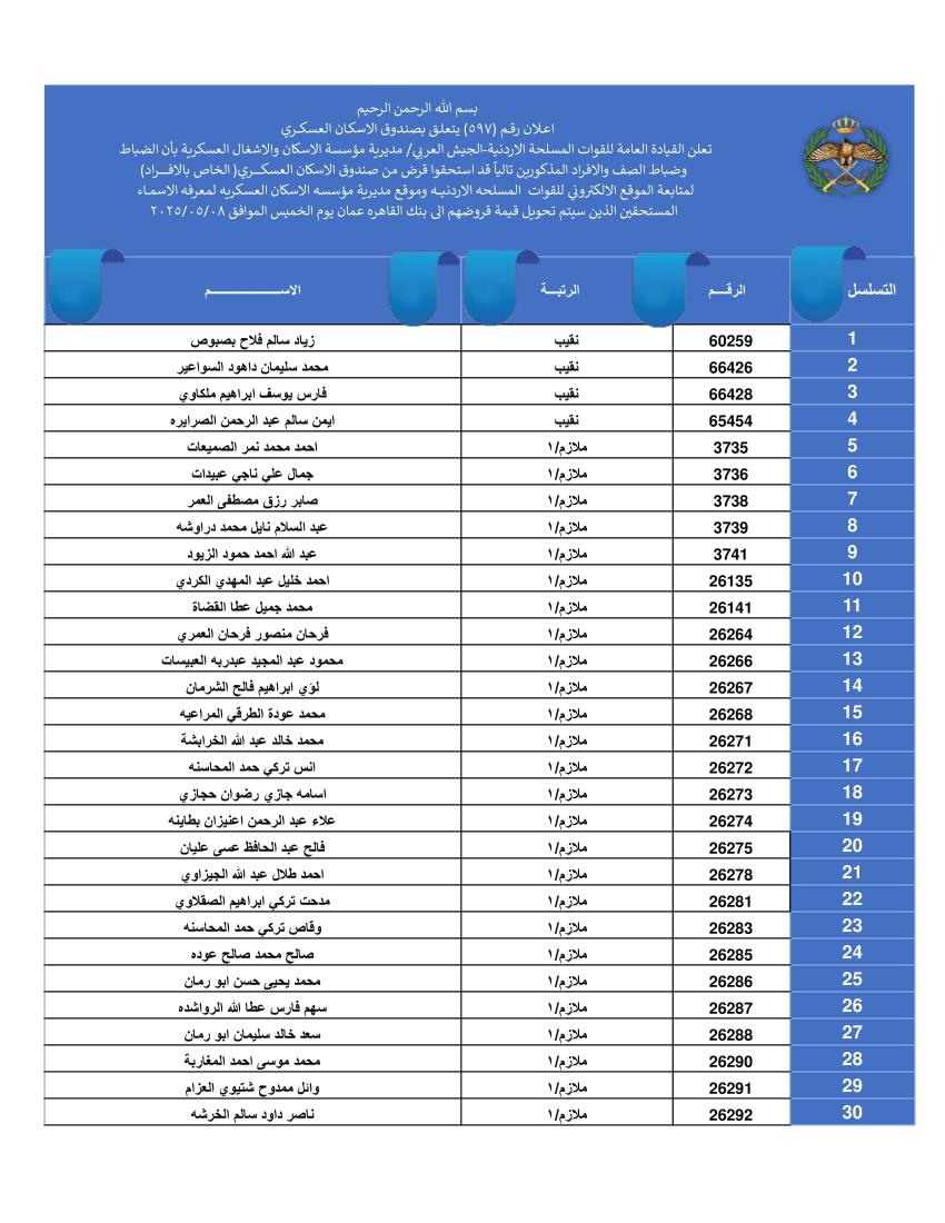 ودعت الضباط وضباط الصف والأفراد المبينة أسماءهم أدناه المستحقين لقرض الإسكان العسكري (الخاص بالافراد) والضباط المستفيدين من صندوق إسكان الضباط مراجعة بنك القاهرة عمان بكافة فروعه خلال ساعات الدوام الرسمي اعتباراً من يوم الخميس الموافق 8/05/2025 للحصول على القرض.