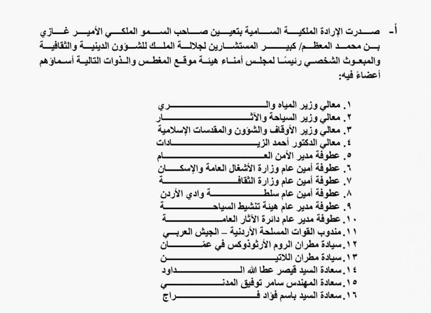 صدرت في عدد الجريدة الرسمية اليوم الأحد، الارادة الملكية السامية بتعيين الأمير غازي بن محمد رئيسا لمجلس امناء هيئة موقع المغطس.