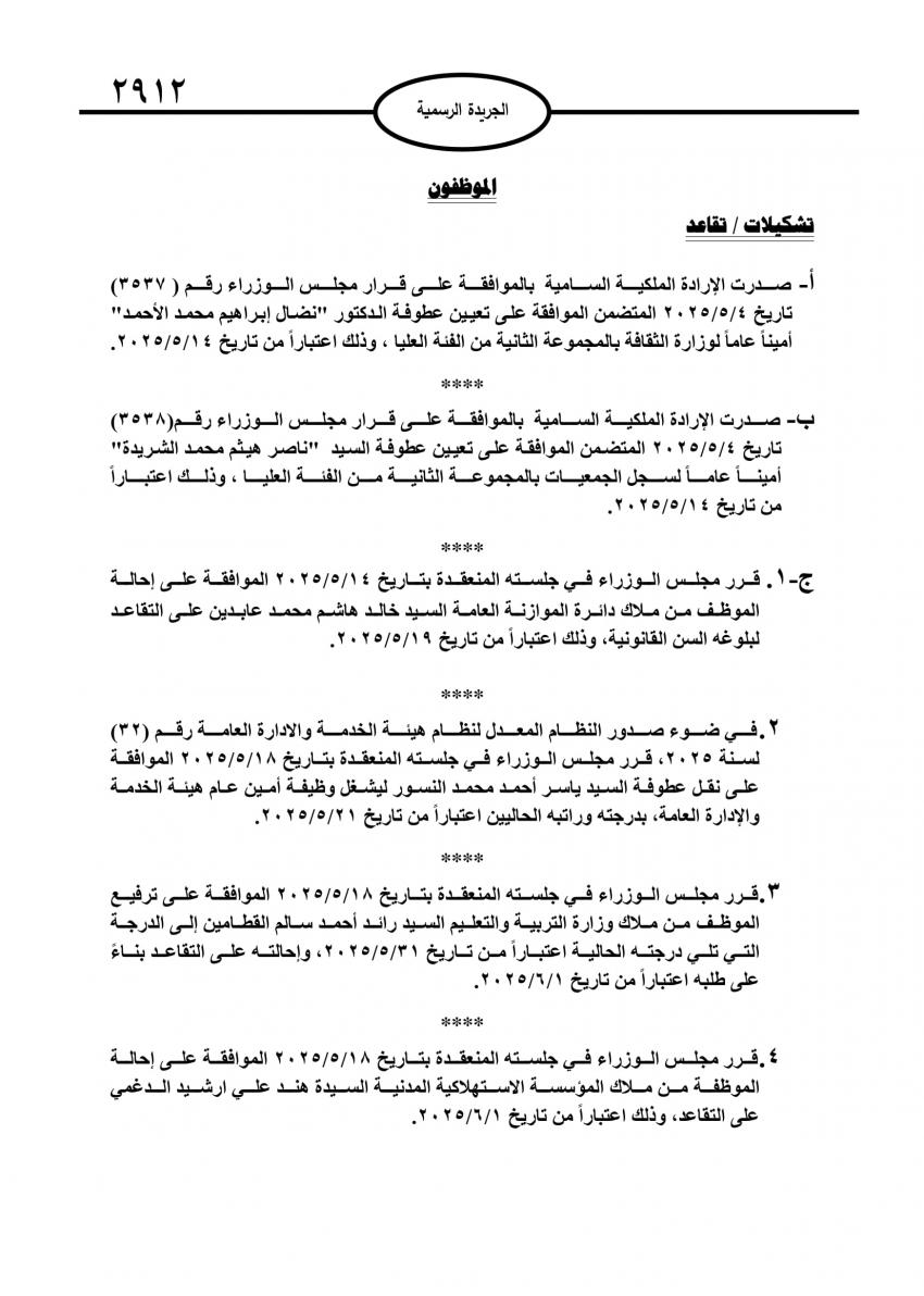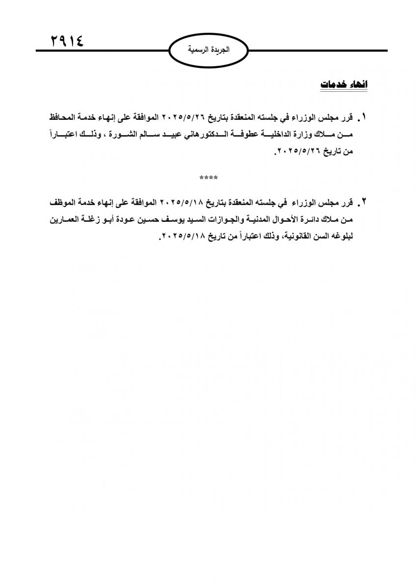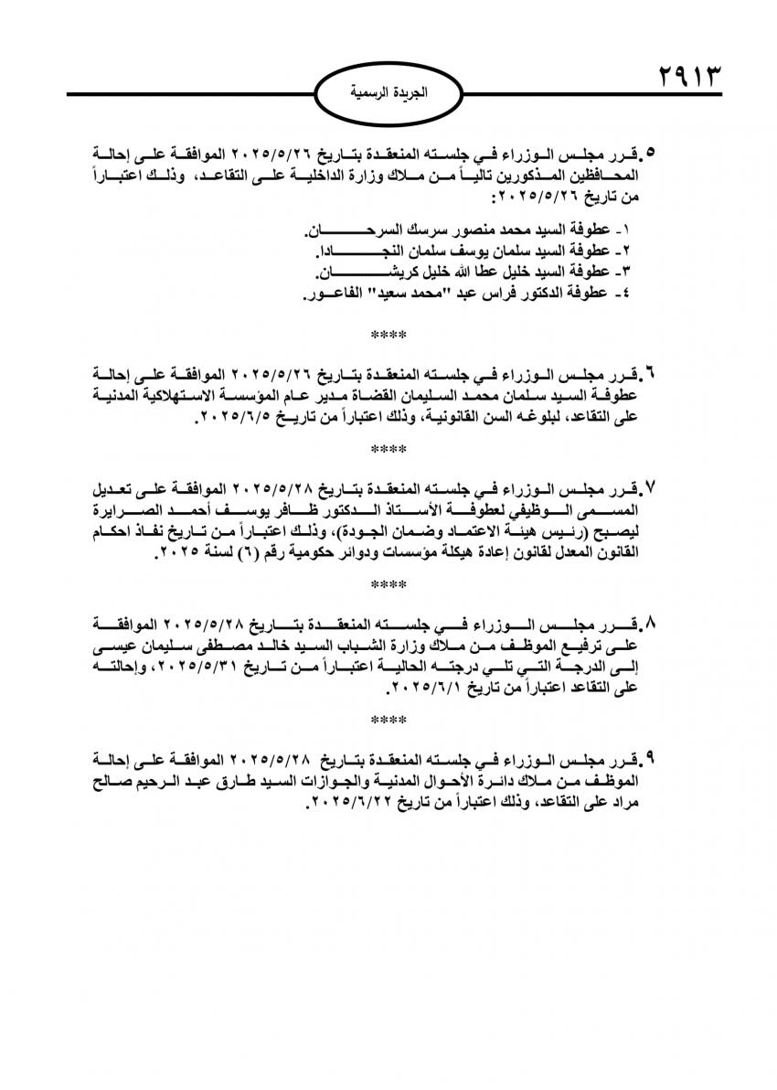 صدر في عدد الجريدة الرسمية اليوم الأحد، قرارات مجلس الوزراء بإحالة عدد من موظفي الدولة إلى التقاعد، وانهاء خدمات اخرين.