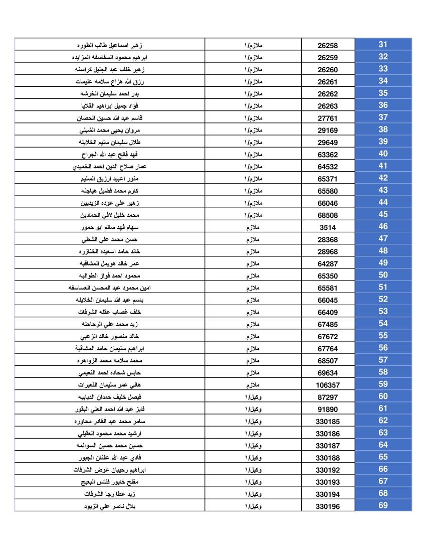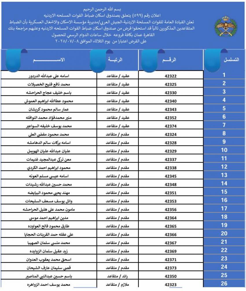 أعلنت القيادة العامة للقوات المسلحة الأردنية – الجيش العربي/ مديرية مؤسسة الإسكان والأشغال العسكرية، اسماء المستحقين لقرض الإسكان العسكري.