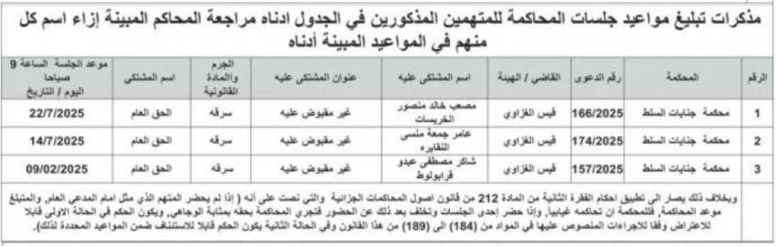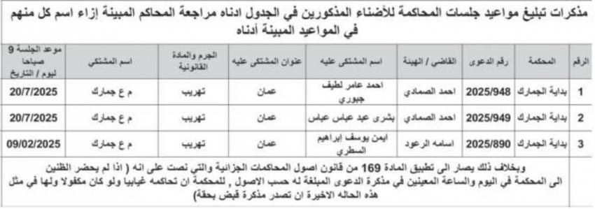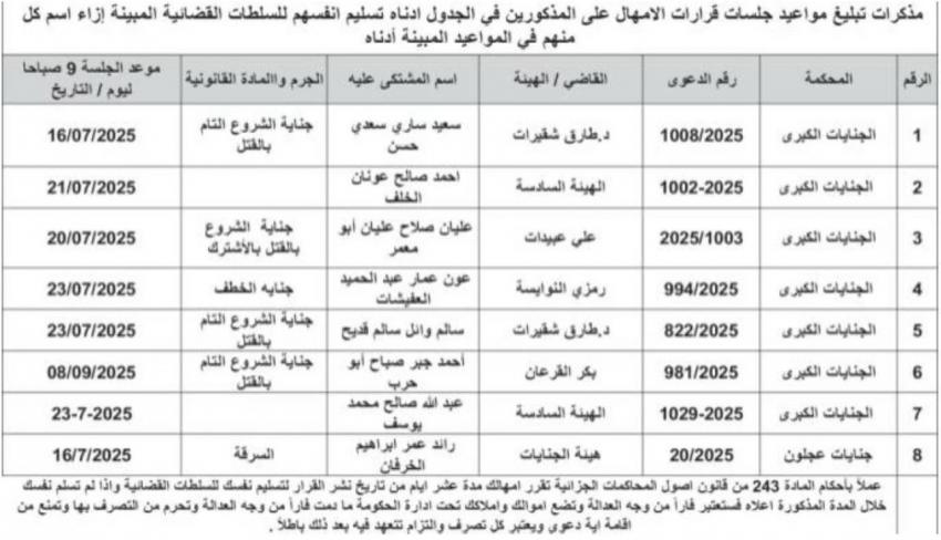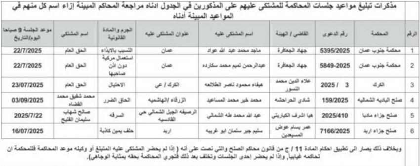 مذكرات تبليغ مواعيد جلسات محاكمات لأردنيين (اسماء)