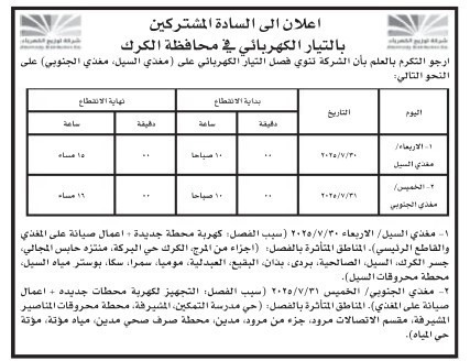 أعلنت شركة توزيع الكهرباء عن فصل التيار الكهربائي عن مناطق في المملكة غدا الأربعاء.