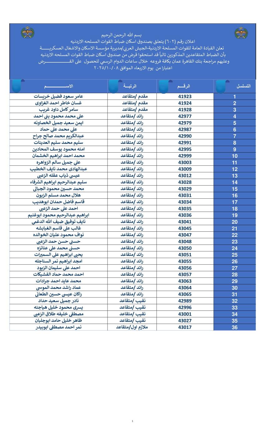 - أعلنت القيادة العامة للقوات المسلحة الأردنية – الجيش العربي/ مديرية مؤسسة الإسكان والأشغال العسكرية، اسماء الضباط وضباط الصف والأفراد المستحقين لقرض الإسكان العسكري (الخاص بالافراد) ومن صندوق إسكان الضباط.