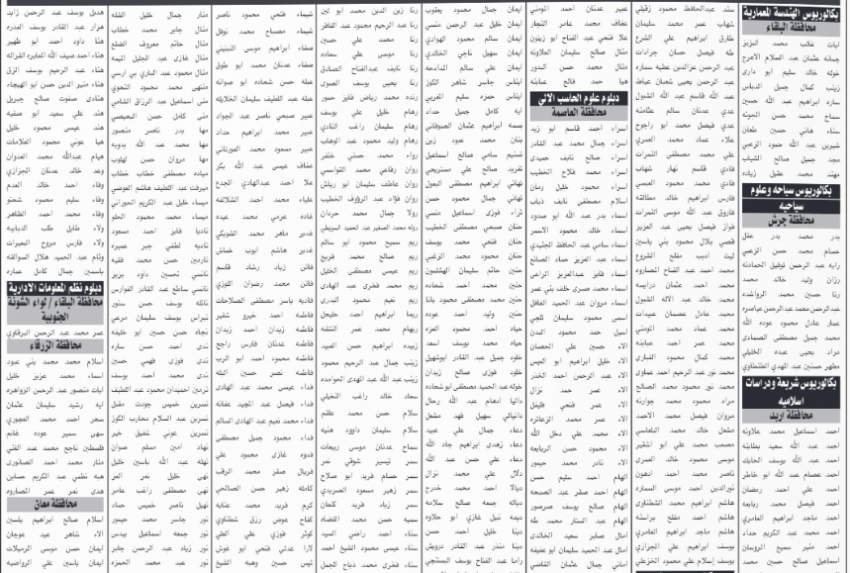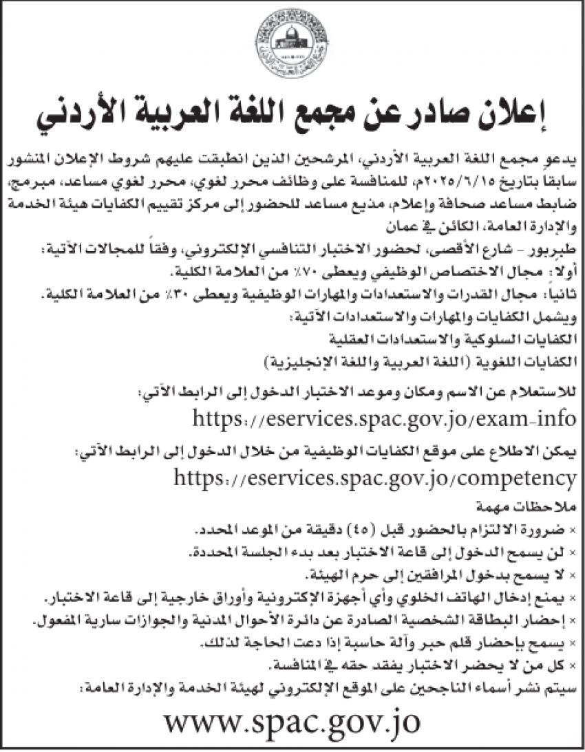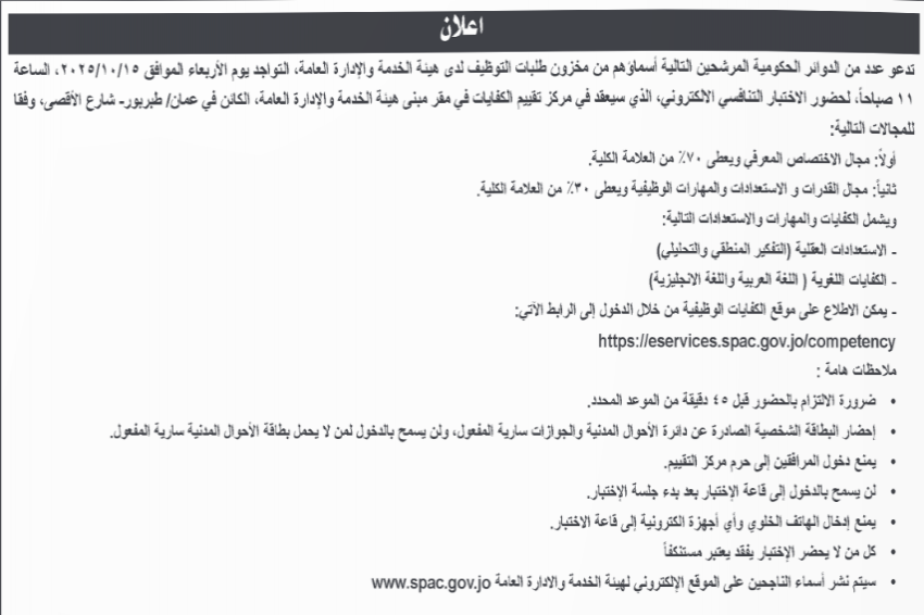 دعت عدد من الدوائر الحكومية المرشحين التالية أسماؤهم من مخزون طلبات التوظيف لدى هيئة الخدمة والإدارة العامة، التواجد يوم الأربعاء الموافق 15/ 10/ 2025، الساعة 11 صباحًا، لحضور الاختبار التنافسي الإلكتروني، الذي سيعقد في مقر مبنى هيئة الخدمة والإدارة العامة، الكائن في عمان/ طبربور - شارع الأقصى.