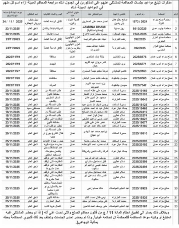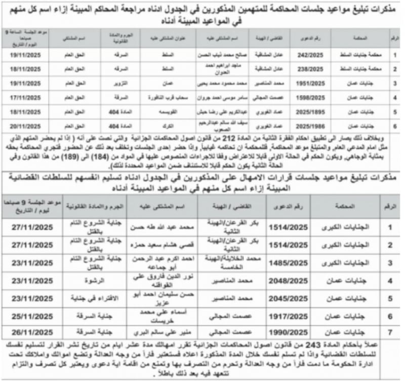 صدرت الاثنين 17/11/2025 مذكرات تبليغ مواعيد جلسات المحاكمة لمشتكى عليهم ولمتهمين ولأظناء وقرارات إمهال.