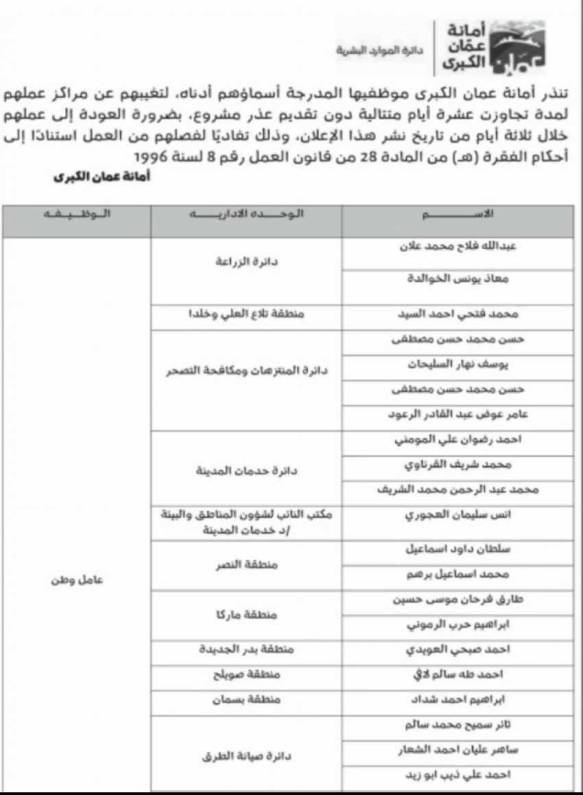 أمانة عمّان تُنذر 32 موظفًا بالفصل (أسماء)