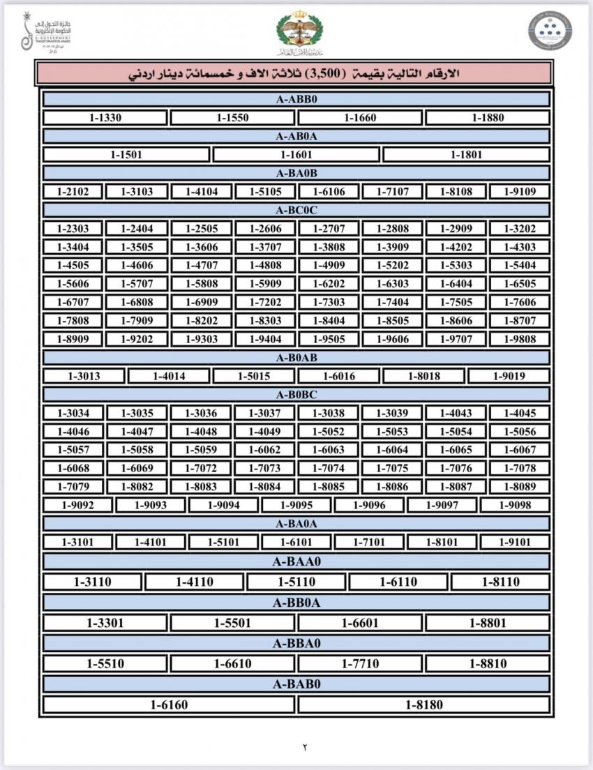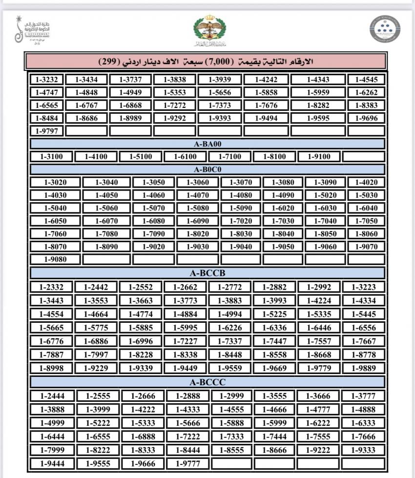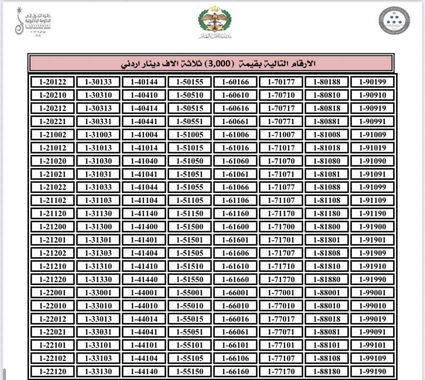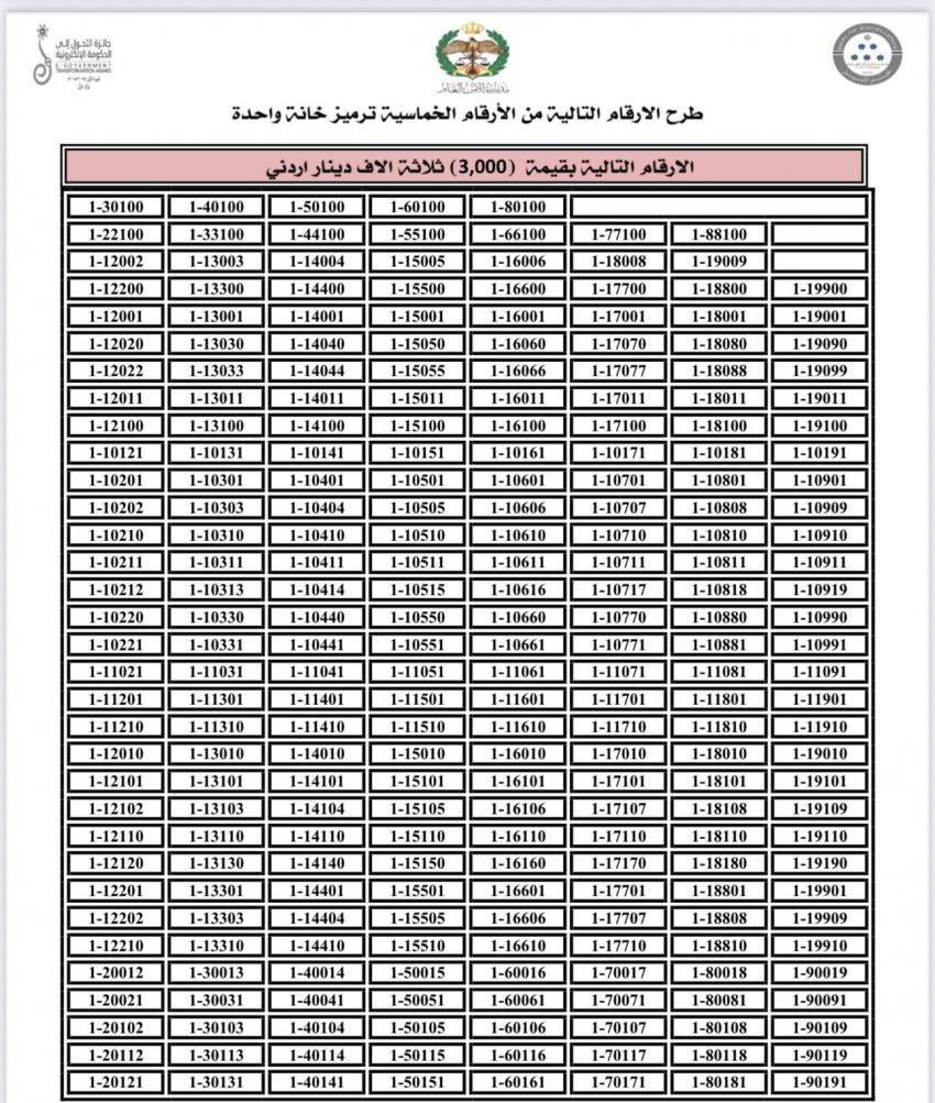 وكانت أعلنت إدارة الترخيص في مديرية الأمن العام، طرح أرقام مركبات مميزة من ترميز 1 للبيع المباشر عبر بوابتها الإلكترونية.