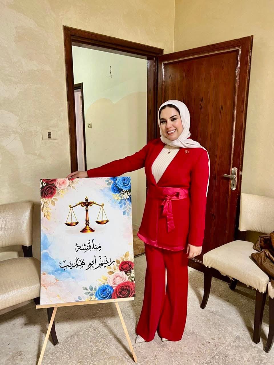 الوالد والوالدة والأخوة والأخوات والأهل والأصدقاء جميعا يهنئون ابنتهم المحامية رنيم ابو هديب لحصولها على درجة الماجستير في القانون العام ، متمنين لها المزيد من التقدم والنجاح باذن الله.