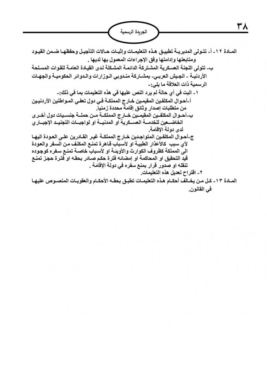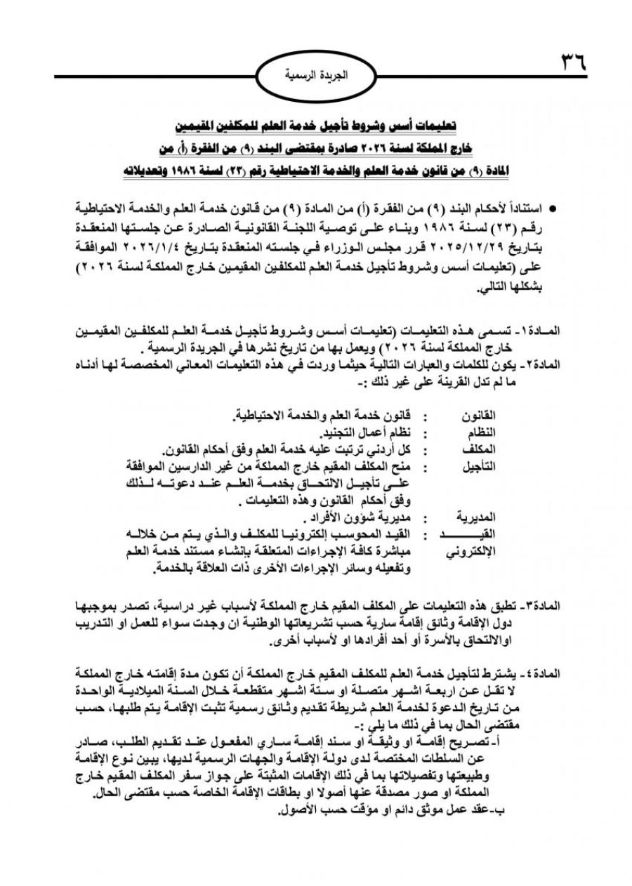 صدر في عدد الجريدة الرسمية اليوم الخميس، تعليمات أسس وشروط تأجيل خدمة العلم للمكلفين المقيمين خارج المملكة لسنة 2026.