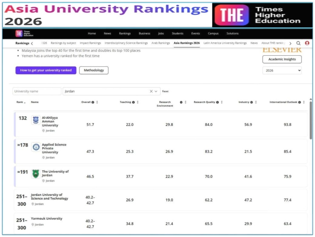 حققت جامعة عمان الأهلية إنجازاً أكاديمياً جديداً بتصدرها الجامعات الأردنية في تصنيف Times Higher Education Asia University Rankings 2026، حيث جاءت في المرتبة 132 آسيوياً، متقدّمةً أربعاً وخمسين مرتبة عن نتيجتها في تصنيف العام الماضي (2025) ، ولتكون بذلك الجامعة الأردنية الأعلى تصنيفاً على مستوى المملكة.