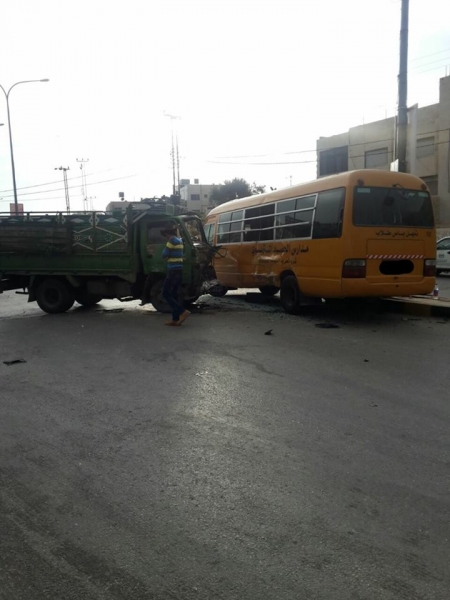 اصابة ثلاثة طلاب ومعلمة اثر تصادم باص مدرسة وبكب في ناعور