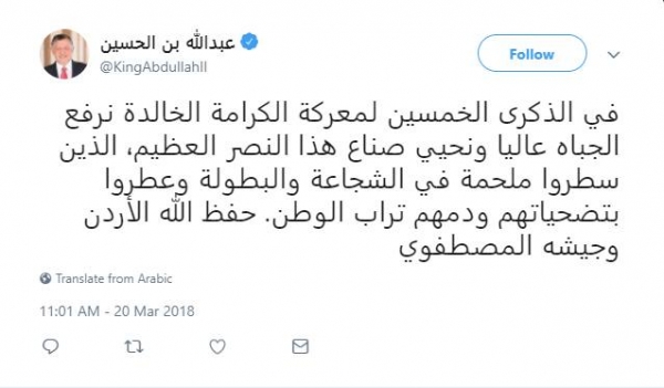 الملك وولي العهد يتلقيان برقيات تهنئة بالذكرى الخمسين لمعركة الكرامة
