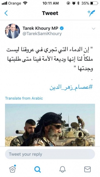 النائب طارق خوري ينعى الضابط السوري المثير للجدل زهر الدين