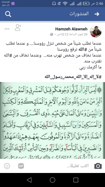 شاهد آخر ما كتبه الشهيد حمزة العلاونه عبر صفحته الشخصية على الفيسبوك