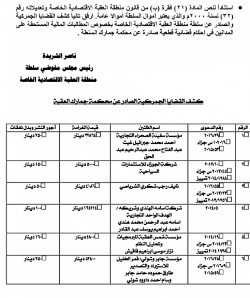 العقبة الخاصة تطالب 6 مؤسسات بدفع 253 الف دينار كغرامات