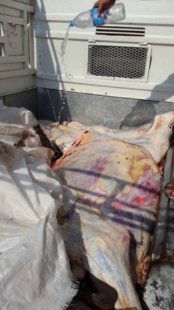 بالصور .. شرطة بيئة الزرقاء تضبط عجل بوزن 300 كغم غير صالح للأكل ..والصحة تتلفه