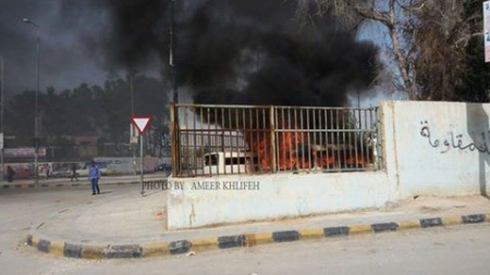 شاهد بالصور ... اعتداء على دوائر حكومية ،،واحراق مركبات من قبل محتجين في مخيم البقعة