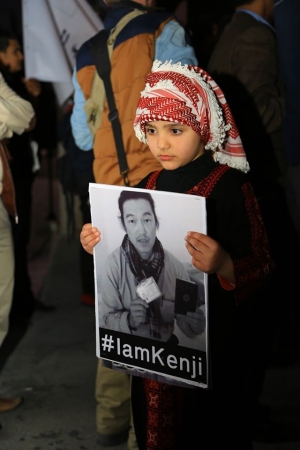 بالصور طفلة تخطف انظار الصحفيين في وقفة أمام السفارة اليابانية في عمان،