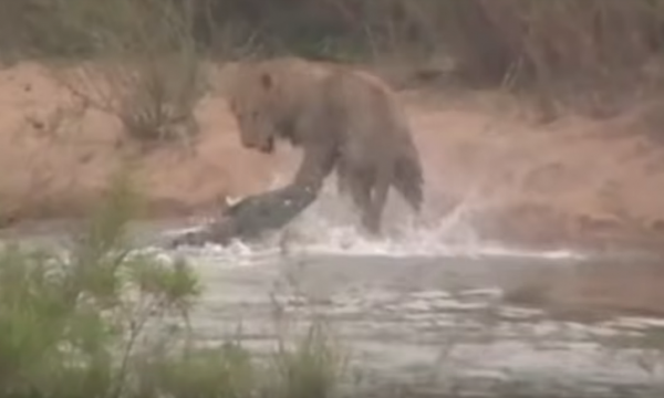 بالفيديو .. ماذا حدث لأسد عبَرَ نهراً وفاجأه تمساحٌ ضخم من تحت المياه؟!