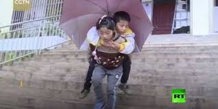 بالفيديو :في قصة مؤثرة .. طفلة تحمل شقيقها المعاق على ظهرها إلى المدرسة كل يوم