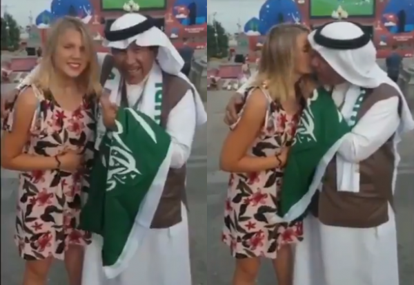 بالفيديو .. هكذا احتفل مسن سعودي مع فتاة روسية بفوز منتخب بلاده على مصر