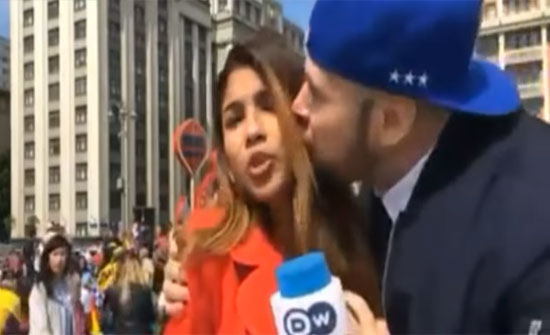 بالفيديو .. مشجعة روسية تقبل مذيع مصري على الهواء مباشرة