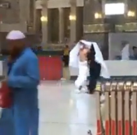 بالفيديو .. ماذا فعل رجل في الحرم المكي ليحمي زوجته من الأمطار؟!