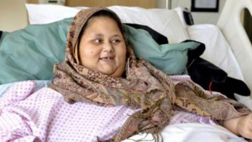 اين وصلت صاحبة النصف طن بعد انتهاء المرحلة الاولى من علاجها في ابوظبي؟